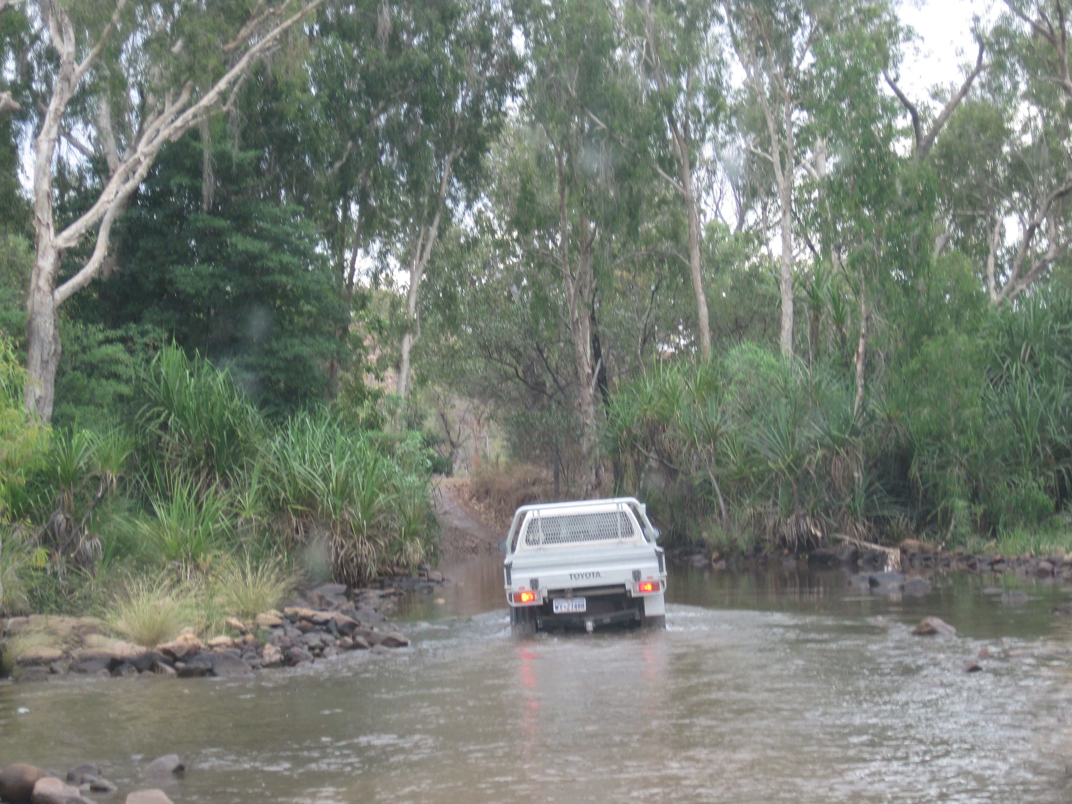 It took less time to drive back from the Bungle Bungles over the corrugated road to the main road. We stopped at a roadhouse where the choice for lunch seemed to be only meat pies. We had to retrace our steps almost all the way back to Kununurra then turned off on another gravel road to El Questro. There were more corrugations. We turned a corner and suddenly found that the road crossed a river which seemed fairly deep. We just waited for another vehicle to drve through to check the depth and found that the Pajero was absolutely fine.